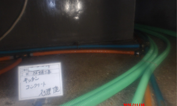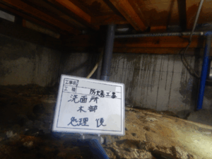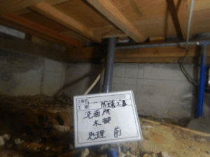 床下全体の薬剤散布と、木部の防蟻処理、そして床下環境の確認(湿気・配管状態・基礎のひび割れ等)を行いました。