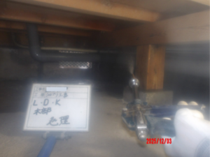 床下点検を行ったところ、シロアリ被害は見られず、前回の防蟻処理がしっかり効果を発揮している状態でした。
