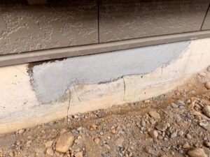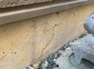 点検中に、外部基礎の爆裂(コンクリートの剥離)や複数のクラックを発見しました。
