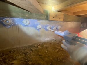 基礎の内側・外側から、エポキシ樹脂を注入ドーム工法にて圧入補修。