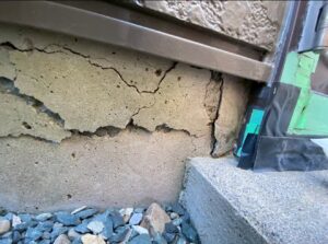 点検中に、外部基礎の爆裂(コンクリートの剥離)や複数のクラックを発見しました。