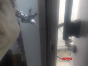 玄関ドア枠のビスを一度取り外し、枠の内部へも薬剤を注入。