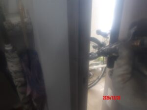 玄関ドア枠のビスを一度取り外し、枠の内部へも薬剤を注入。