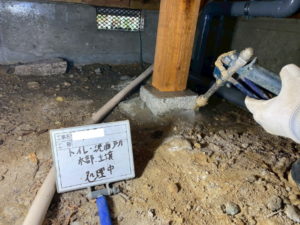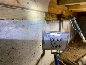 まず浴室解体後のタイミングで、露出した木部および土壌に対して薬剤処理を実施しました。