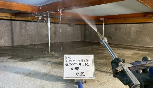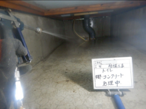 まずは床下に入り、木部および土壌部分へ「アジェンダMC一液」を散布し、シロアリ予防処理を実施しました。