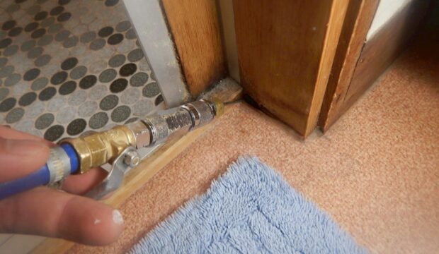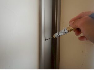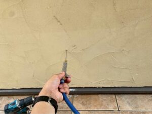 その後、外部袖壁内の木部に対しても処理を行うため、目立たない位置に3.5mm径の小さな穴を開け、専用ノズルを使用して薬剤を注入。